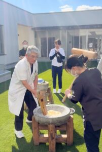 全職員が 餅つきに参加できるように 出来立ての柔らかい お餅が食べられるように!と、休憩時間中に3回に分けて行われていました。