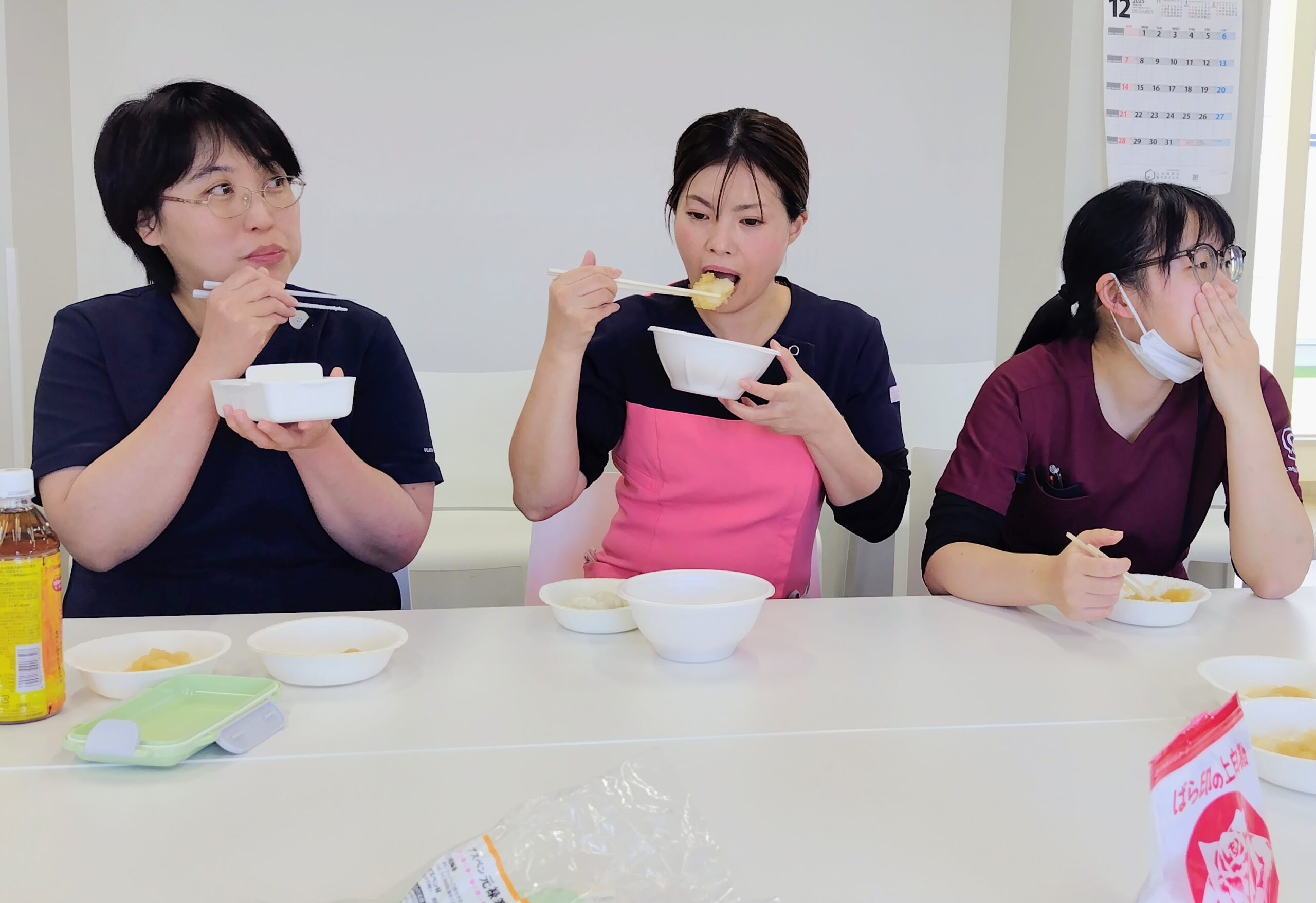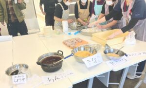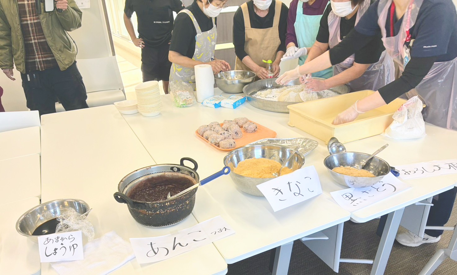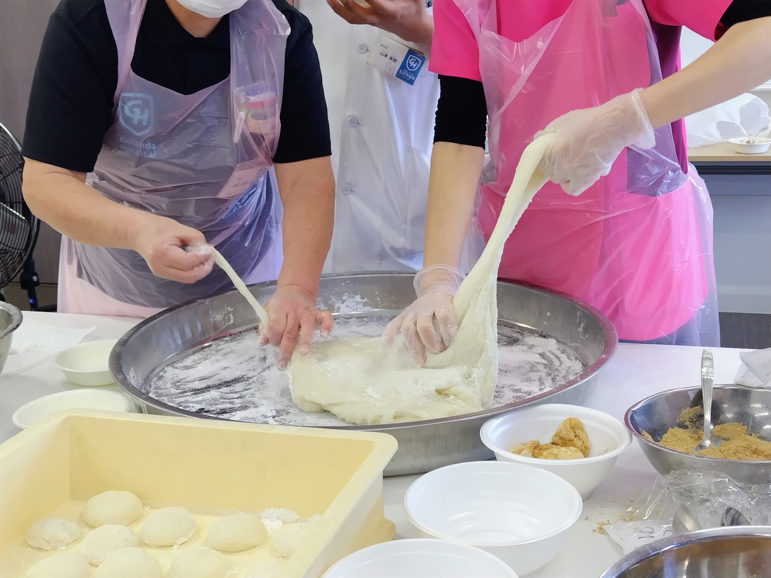 で、出来立てのお餅は~「私たちは、五反田病院 婦人部でっす!」とノリノリの師長・副師長・検査室長・園田看護師たちが会議室で手際よく(?)丸めてて提供してくれました。 味は ⓵餡子 ⓶黄粉 ⓷黒糖 ⓸大根おろし ⓹砂糖醬油 というベストチョイス♪です。