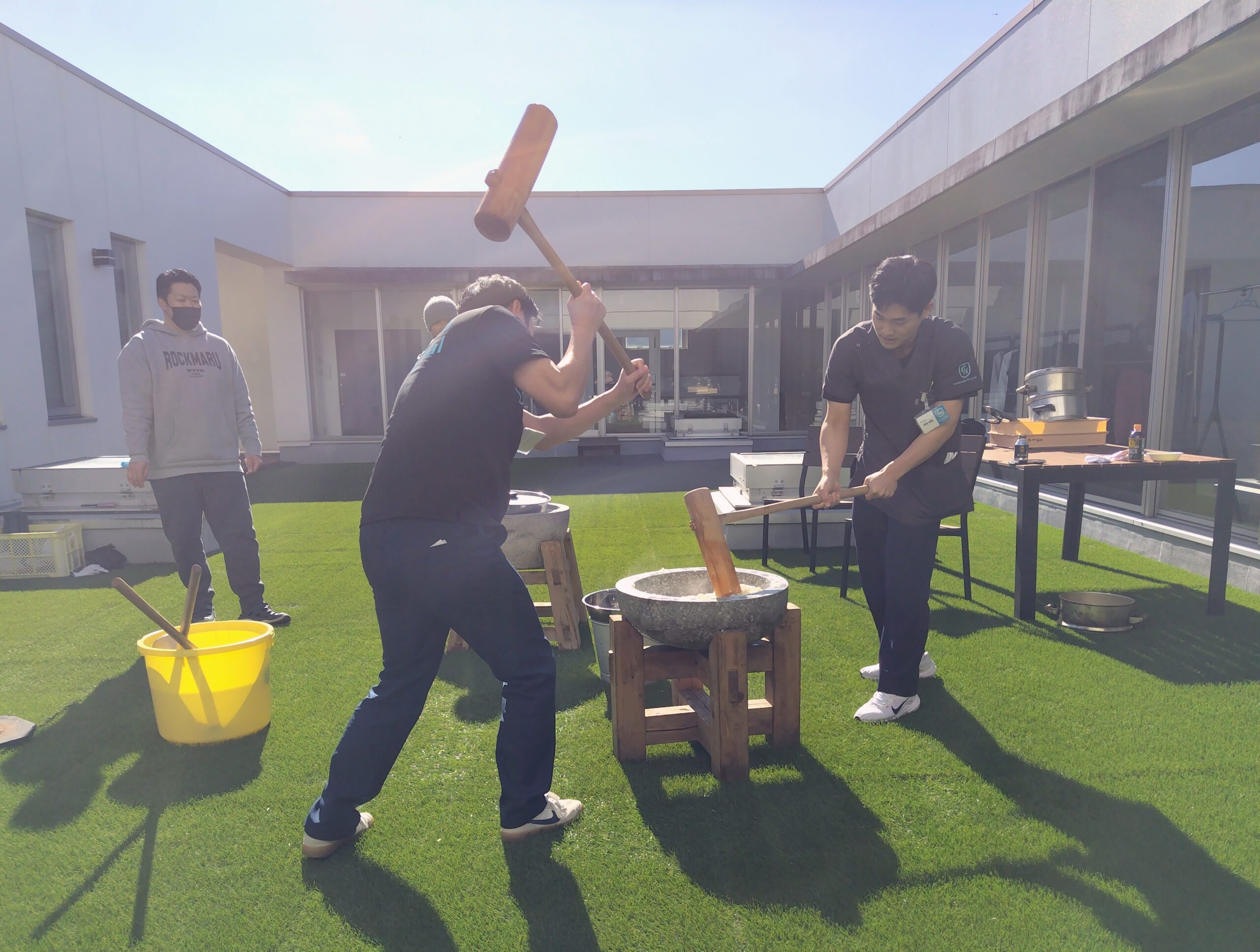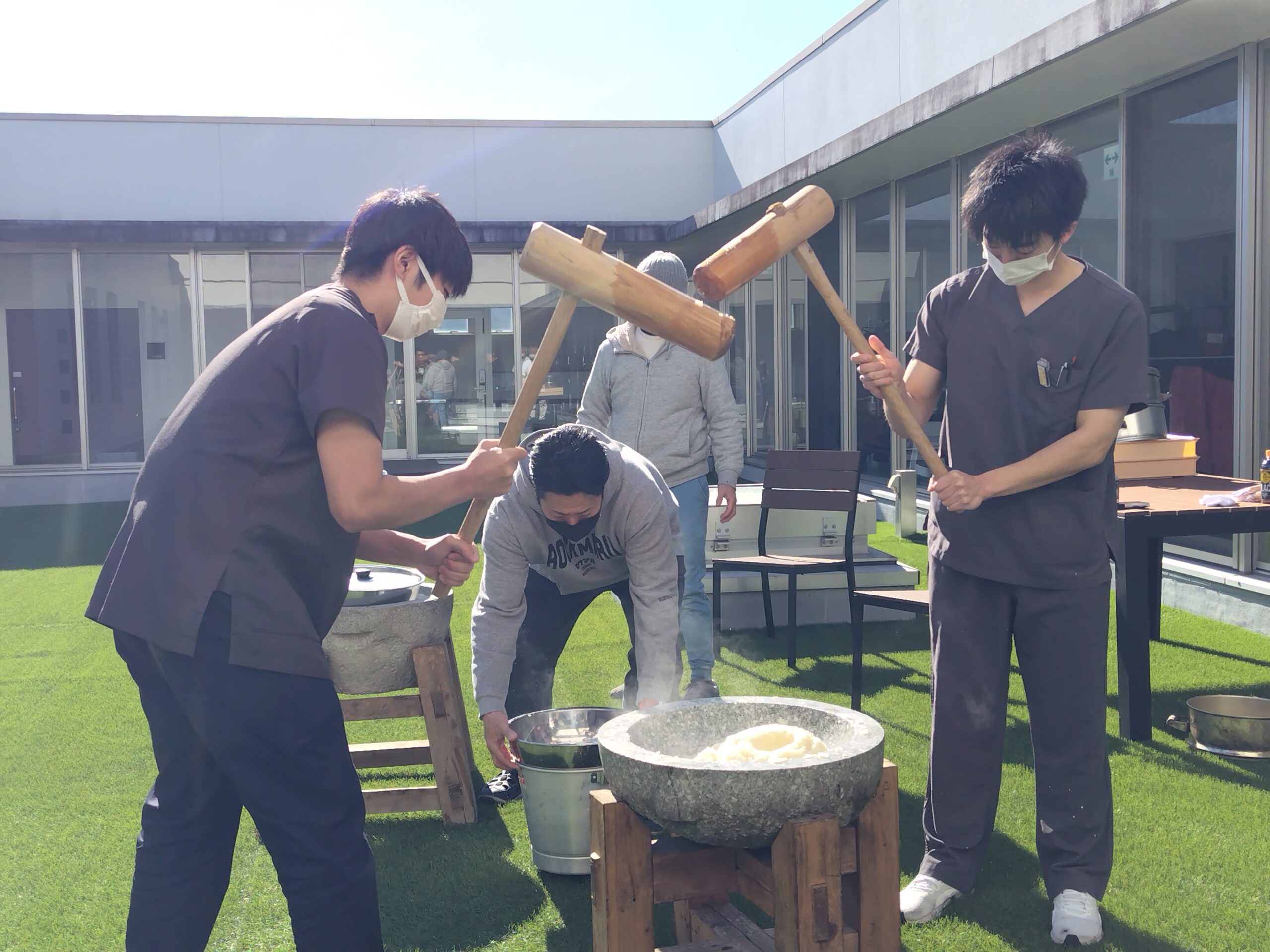 1月8日(木)、五反田病院の開院記念日と、新しい一年の縁起担ぎを兼ねて、餅つき大会が行われました。場所は3階の芝生エリアです。