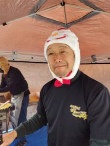 なんと トナカイとスノーマンらしき被り物をして鉄板に向かう おやじーズの姿がありました。 誰かに被らされたんですか?