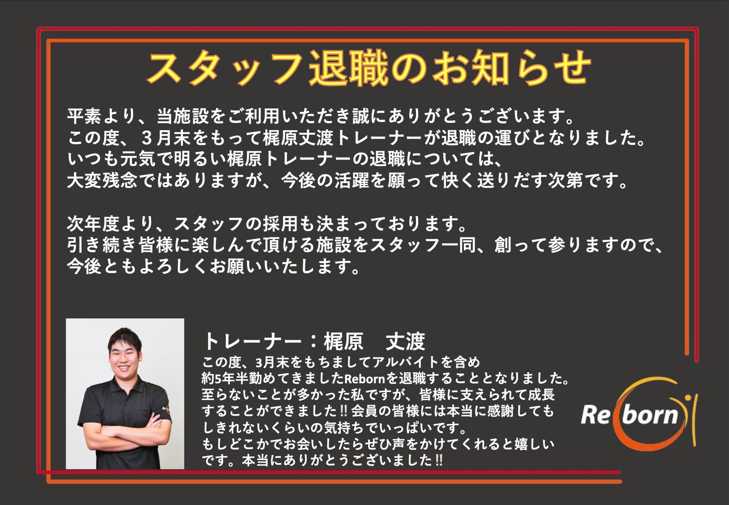 長年「Reborn」を支えてくれた、元気印の梶原丈渡トレーナーが、3月末をもって退職することとなりました。