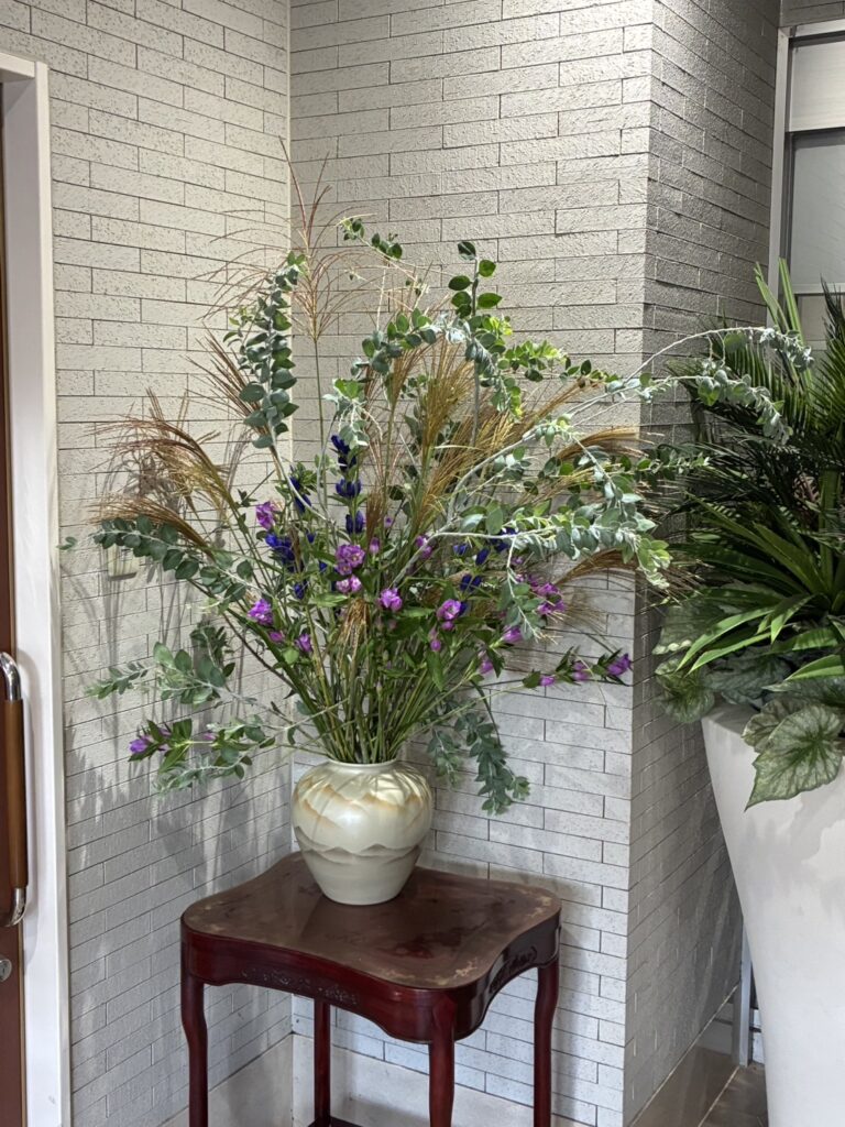秋の風情を感じるアカシア、竜胆、ススキの花々を使い、利用者お一人お一人、一本ずつ丁寧に花を生け、世界に一つだけの作品が完成しました。